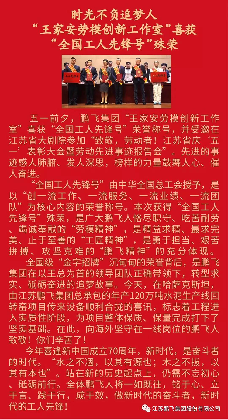 鵬飛王家安勞模創(chuàng)新工作室喜獲全國工人先鋒號