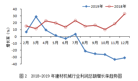 2019年,建材機(jī)械行業(yè)累計(jì)實(shí)現(xiàn)利潤總額36.57億元,同比下降31.00%,增速較上年同期回落64.26個(gè)百分點(diǎn),落后于建材工業(yè)(15.6%)、機(jī)械工業(yè)(-4.53%)的增速,遠(yuǎn)低于建材機(jī)械相關(guān)領(lǐng)域工程機(jī)械(16.48%)、重型礦山機(jī)械(21.65%)增速。從增速變化趨勢(shì)看(見圖2),全年利潤總額增速下行態(tài)勢(shì)明顯,且與上年相比回落較大,降幅最高達(dá)64.26個(gè)百分點(diǎn)。
