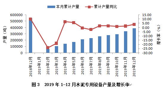 從行業(yè)重點(diǎn)監(jiān)測(cè)的產(chǎn)品看,水泥專用設(shè)備產(chǎn)量實(shí)現(xiàn)小幅增長,2019年累計(jì)完成38.65萬噸,同比增長3.69%,較上年同期下降6.37個(gè)百分點(diǎn)。從全年產(chǎn)量增速變化趨勢(shì)看(見圖3),上半年波動(dòng)較大,下半年逐步趨緩、趨穩(wěn)。