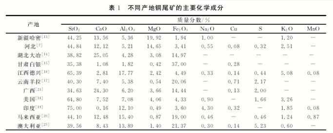 銅尾礦的化學組成非常復雜,不同產(chǎn)地的銅尾礦之間可比較性差,這是銅礦石成礦地質(zhì)、礦石開采方法、選礦工藝以及銅尾礦堆存方式等差異所致。組成銅尾礦的主要元素有 Mg、Al、Si、S、Ca、Fe、Cu 等,且 伴 有 Mn、Ti、Zn、Sr等 微 量 元素。不同產(chǎn)地銅尾礦的主要化學成分見表1。