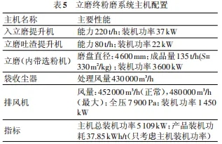此系統(tǒng)主要由立磨、高濃度袋收塵器和風(fēng)機(jī)組成,流程圖見圖 6,主要的主機(jī)配置見表 5。此系統(tǒng)其特點(diǎn)是:流程簡(jiǎn)單,系統(tǒng)電耗低;廠房占地少,立磨又可以露天布置,因此土建費(fèi)用相對(duì)較少;另外立磨的維修量比輥壓機(jī)要少,所以運(yùn)轉(zhuǎn)率較輥壓機(jī)系統(tǒng)高。